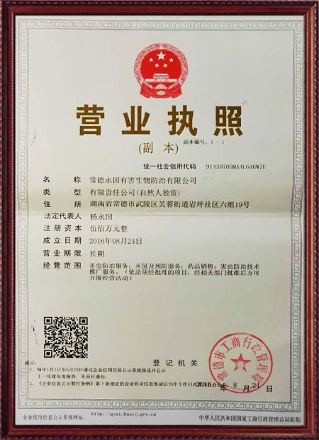 常德永國有害生物防治有限公司以常德市武陵區(qū)永科清潔服務(wù)中心來服務(wù),2016年更名為常德永國生物防治有限公司。做這塊已有十多年豐富的理論支持和實經(jīng)驗。技術(shù)專業(yè)、器械先進。旨在為賓館、酒店、超市、餐廳、工礦、機關(guān)團體、學(xué)校、醫(yī)院及家庭提供快捷、貼心的服務(wù),根據(jù)客戶的實際情況、地理位置,解決鼠、蟲害問題。我們承諾:服務(wù)滿意后付款,只要一個電話解決您的煩惱問題。
